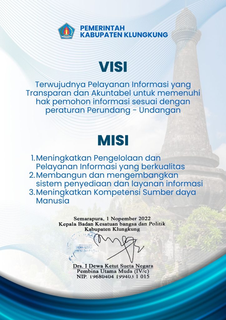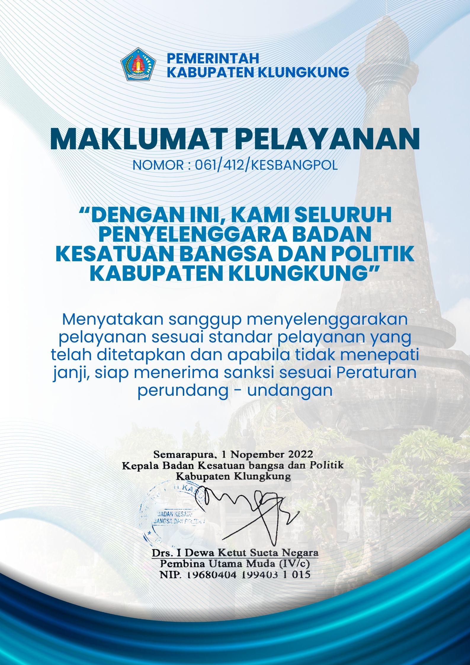 Kami, seluruh penyelenggara Badan Kesatuan Bangsa dan Politik Kabupaten Klungkung, menyatakan sanggup menyelenggarakan pelayanan sesuai dengan standar yang telah ditetapkan. Kami siap menerima sanksi sesuai peraturan perundang-undangan yang berlaku apabila tidak menepati janji pelayanan kami.